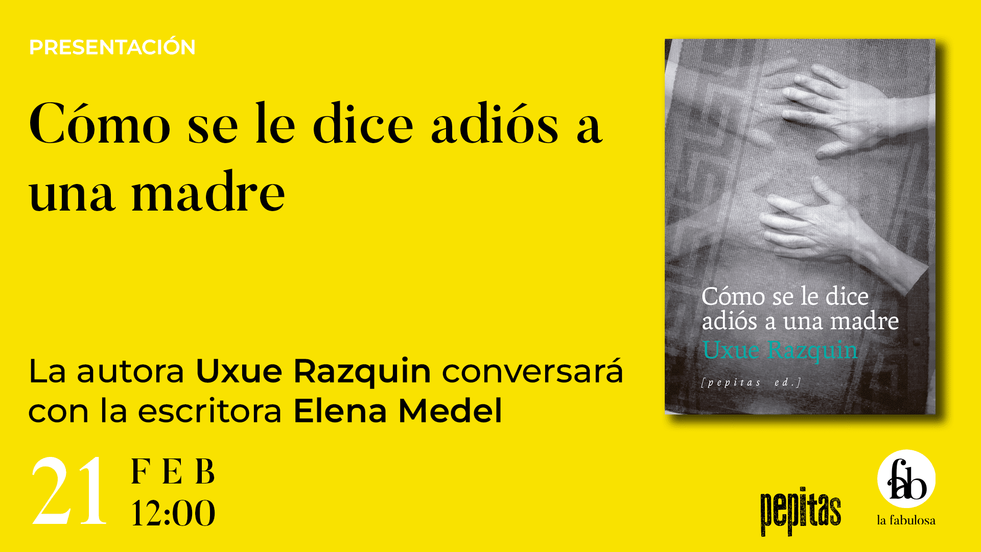Os invitamos a la presentación de Cómo se le dice adiós a una madre de Uxue Razquin (ed. Pepitas). La autora conversará con la escritora Elena Medel. Sábado 21 de febrero a las 12h. Entrada libre hasta completar aforo. ¡Os esperamos!